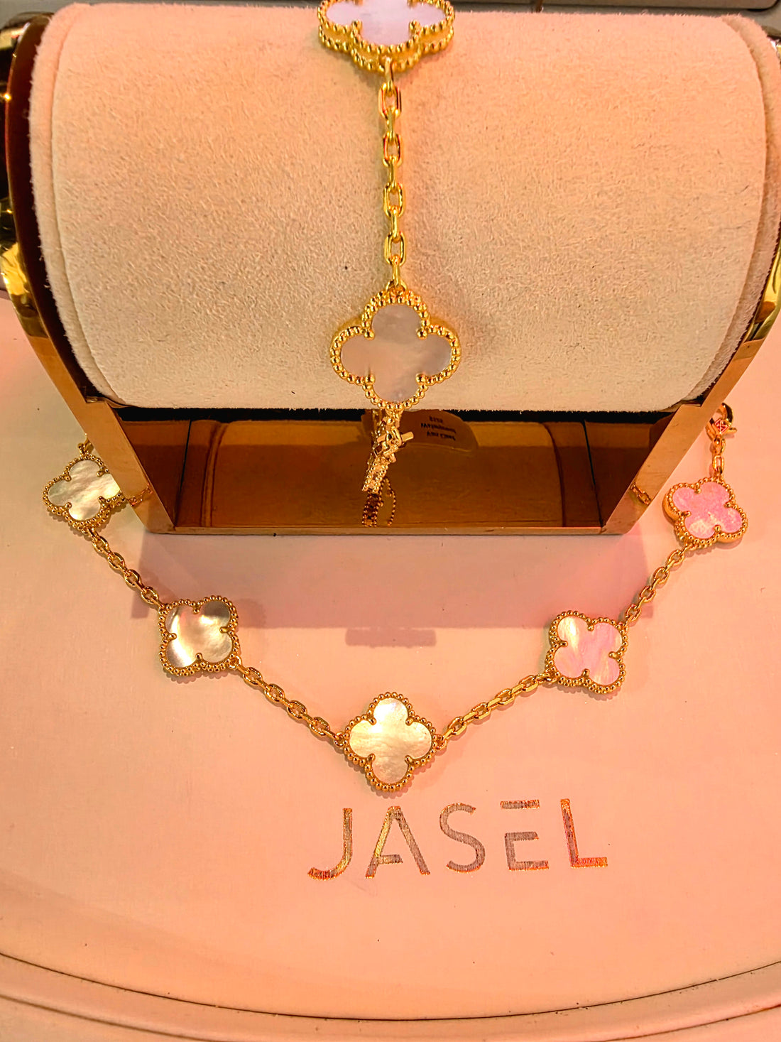 The 5 Clover Gold Pearl Bracelet is a sophisticated accessory that blends timeless elegance with...
