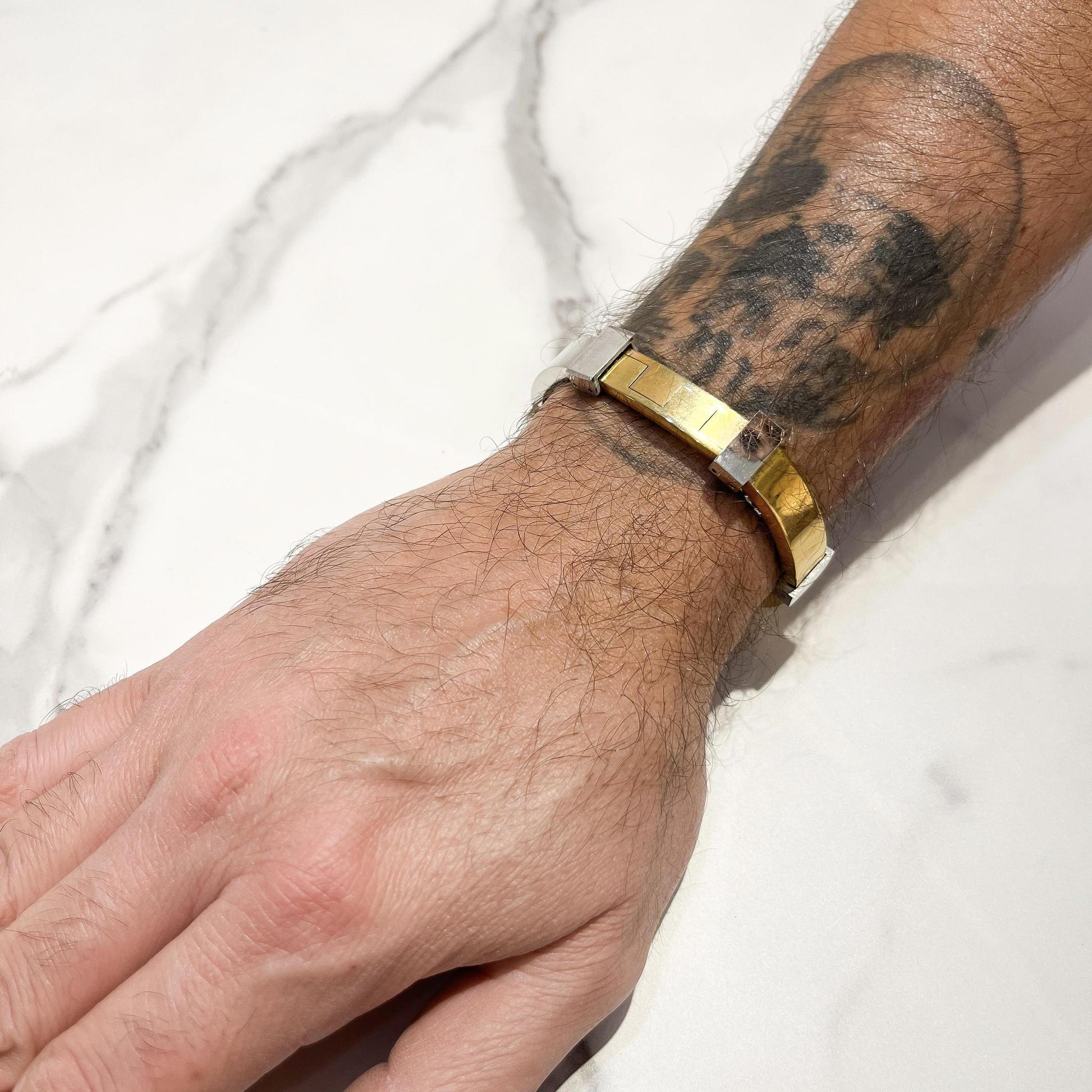 The Kenneth Bracelet makes a bold statement with its captivating combo of gold and silver metals. Its chunky build is sophisticated yet daring, perfect for any event or occasion. Make a strong impression with this attractive and fashionable accessory.